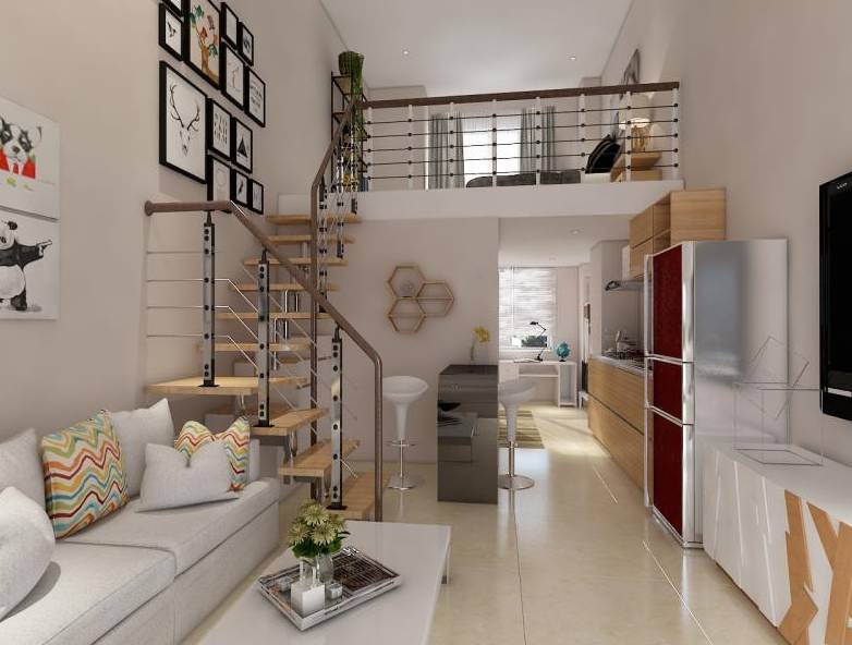 粉色墻面搭配淺黃色地板,營造比較中性與素雅的大環(huán)境,造型小清新的小樓梯為客廳增加了一些趣味性。