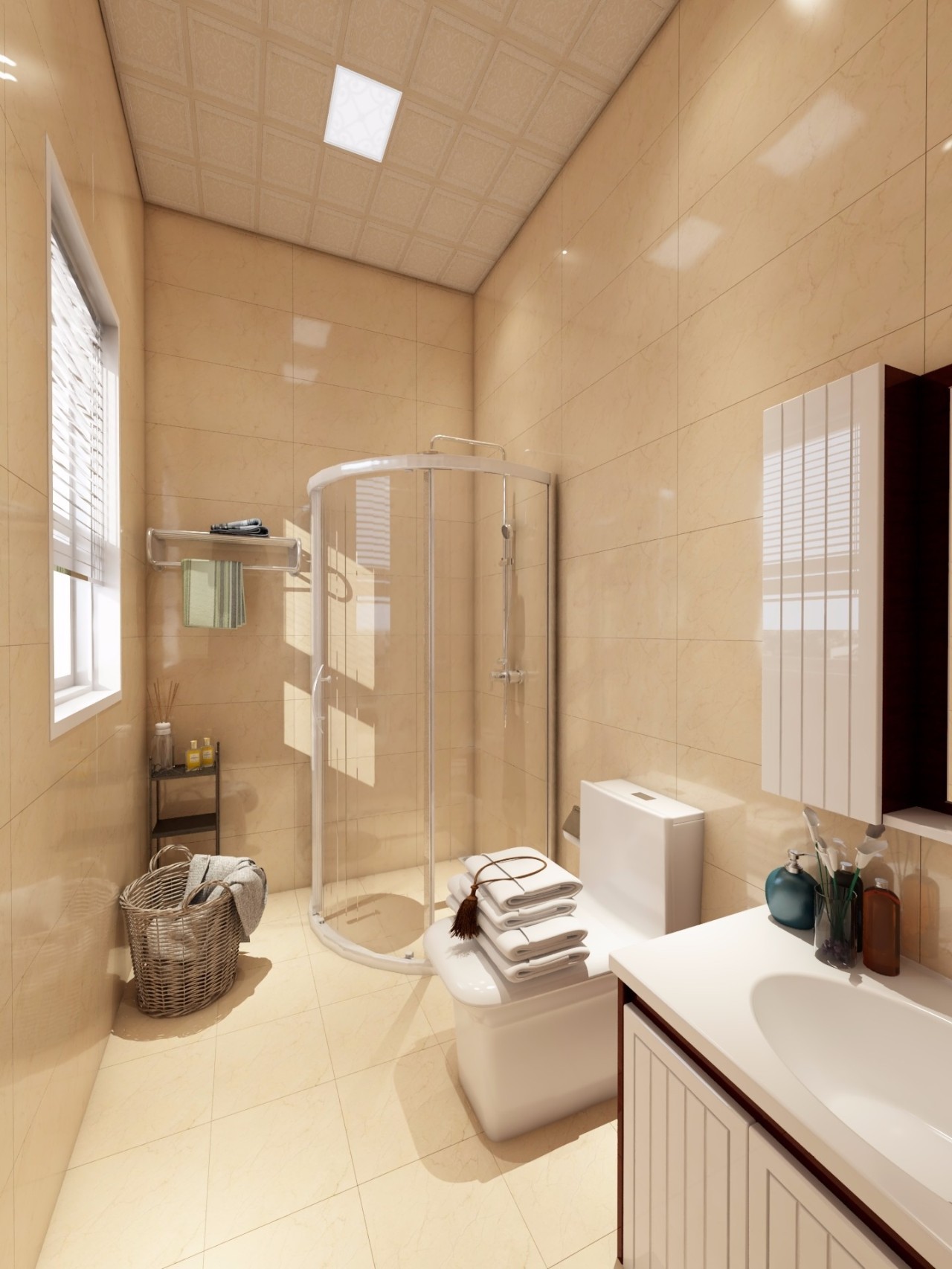 色彩搭配能改變對空間的感覺,鮮艷的色彩令小空間沒有壓抑的感覺。顯得衛(wèi)生間干凈且明亮。暖色的燈光,將白色的墻磚變換成了淡淡的黃色,讓小小的衛(wèi)生間了充滿了溫暖。