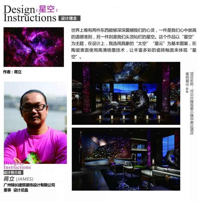 2017年最美瓷磚設計獎評選活動自1月啟動至10月截止報名,共收到來自全國各地設計師個人或機構共105套設計方案。最終,來自設計師蔣立的《星空》、設計師沈雨翔的《Every Step Counts》、廣州道勝設計有限公司的《竹石》、廣州普利策裝飾設計有限公司的《冰·熔》共4套瓷磚產品設計概念方案憑借著新穎的理念、獨具一格的設計脫穎而出,成功入圍,并在本屆紅棉獎頒獎禮中被授予“最美瓷磚設計獎”榮譽。