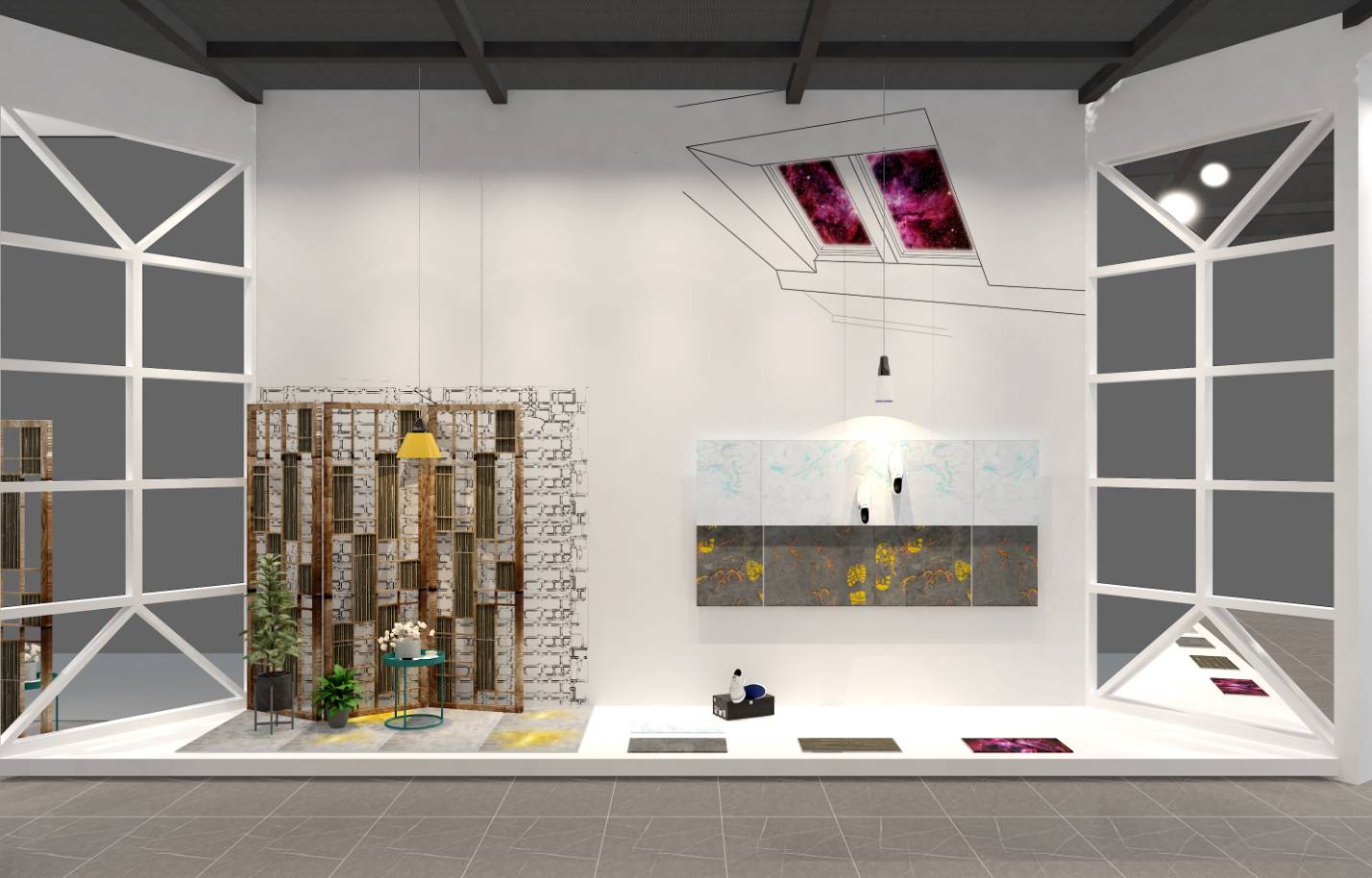 設(shè)計師以主題瓷磚與場景結(jié)合的方式詮釋虛與實的變幻。主題瓷磚“星空”的創(chuàng)意來自宇宙星系的璀璨神秘,為我們呈現(xiàn)了不一樣視覺下的星空之美。