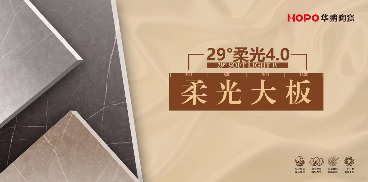 在瓷磚規格上,華鵬陶瓷不斷做出創新性嘗試,從1.0和2.0產品的800*800mm規格,到柔光3.0的900*900 mm規格,再到29°柔光4.0同時擁有900*900mm、600*1200mm、900*1800mm多種大規格,這一突破成功填補行業柔光大板磚的空白市場。
