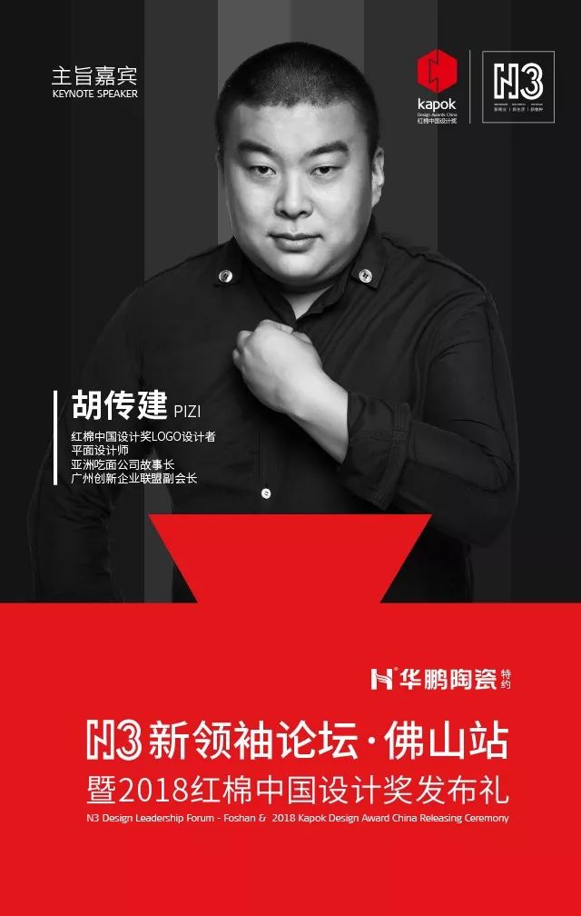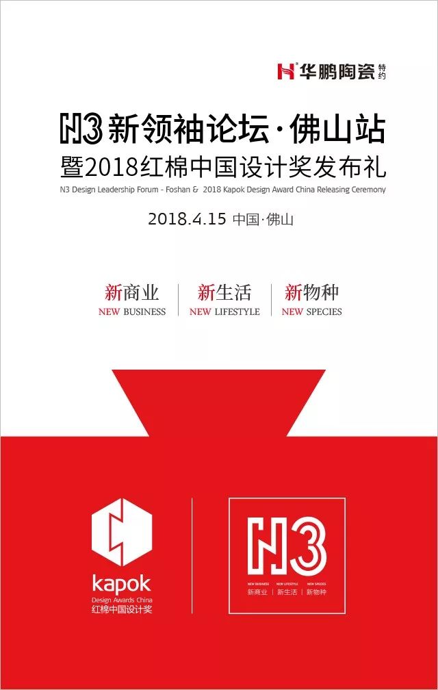 4月15日,由廣州設計周攜手華鵬陶瓷舉辦的“N3新領袖論壇·佛山站暨2018紅棉中國設計獎發布禮”將在佛山·財神酒店二樓宴會廳隆重舉行。活動特別邀請了炙手可熱的N3新生代領袖人物覃思胡傳建(痞子),圍繞【新商業丨新生活丨新物種】帶來一場“開腦洞”的設計模式創新分享大會。