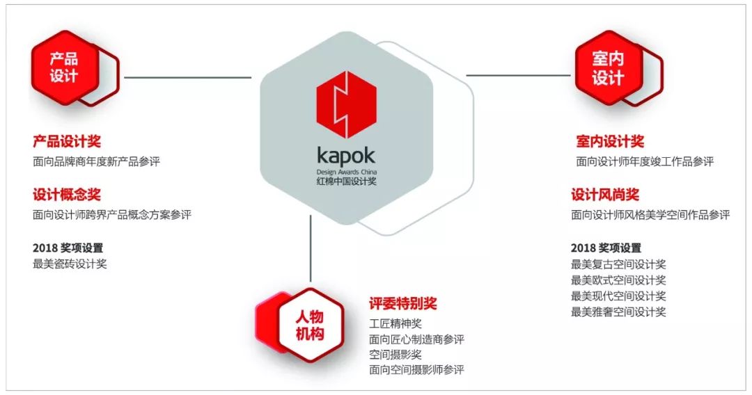 2018紅棉獎將分為“室內設計類”和“產品設計類”兩個大類,面向全國范圍的設計師、品牌企業征集年度竣工室內作品、年度新上市卓越產品,同時還針對室內設計師跨界設計產品、以及消費者對于風格美學設計喜好的需求,設立了多個“設計概念獎”和“設計風尚獎”。