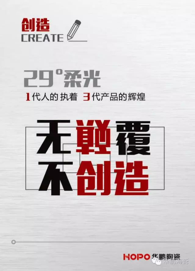 以光澤度來看,國內只有三類瓷磚。光澤度在65°以上的,就是亮面磚;在20°-55°之間的,就是柔光磚;15°以下的,就是啞光磚。2013年以前,以內尚無“柔光磚”這一概念,更談不上研發與生產。憑借著對潮流敏銳的觸覺,華鵬陶瓷看到了柔光磚無限的潛力與商機,在行業尚無企業敢嘗鮮之時,果斷地選擇成為第一個吃螃蟹的人。“如顛覆,不創造”,這是華鵬陶瓷創新精神的完美詮釋。從29°柔光磚Ⅰ的2000目PD技術到柔光磚Ⅱ代額花色突破,再到Ⅲ的意大利多重柔拋技術與模具工以,每一次的新品發布都帶來顛覆傳統的全新體驗。