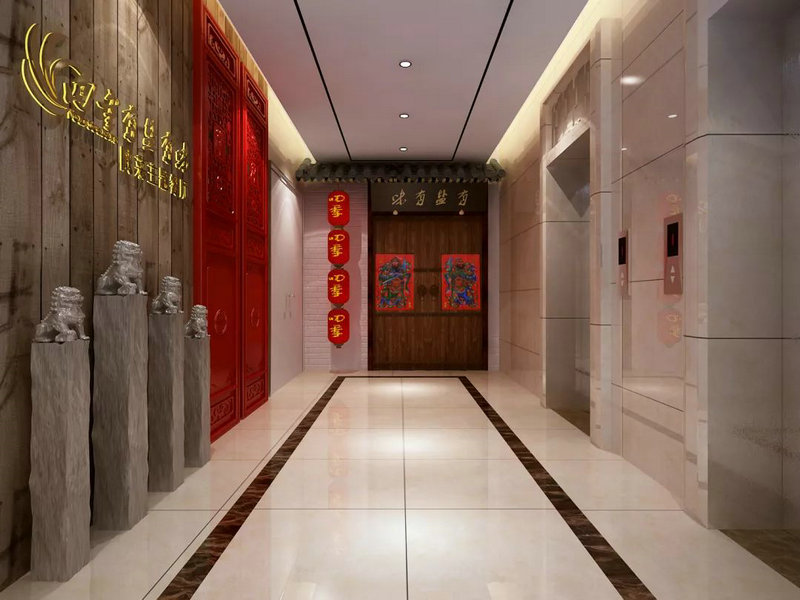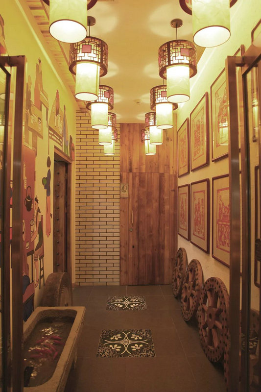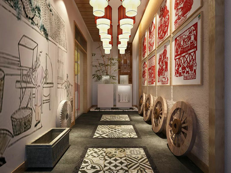 走廊的一側墻壁是由陜西八大怪的剪紙裝裱成的掛畫,另一側 墻則是用現代手繪方式繪制的古代餐飲圖案。在這里,傳統文化與現代創意交相呼應!將整個空間在視覺上給人以強烈的沖擊