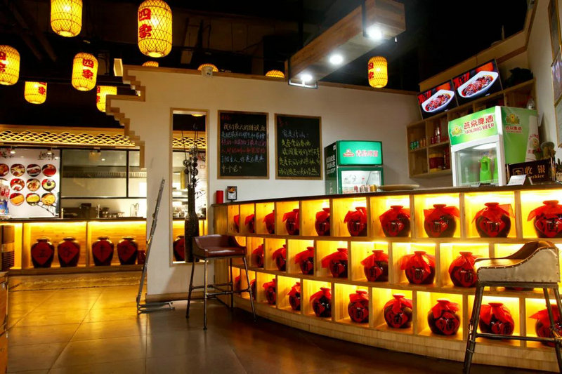 相較于其他中規中矩的吧臺,在這里吧臺被木格鑲嵌著酒罐,加上燈光的裝飾,滿滿的陜西特色,顯得自然而淳樸;墻面膩子掛白留自然紋路,陜西菜名雕刻于木板上掛墻裝飾。
