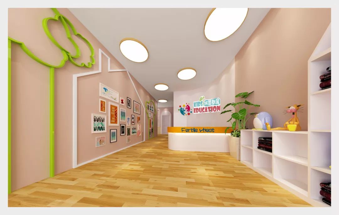 [前臺] 為打造舒適的風格,品味空間帶來的快樂。設計師對前臺區域進行了條理性空間布局改造,既依據空間結構合理布局,減少雞肋空間,又運用簡單鮮明的色彩,營造簡單卻又不失童真、童趣的空間,讓小朋友從來到這里起,便擁抱快樂