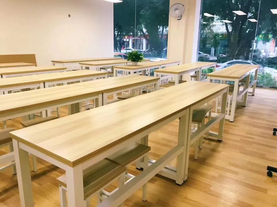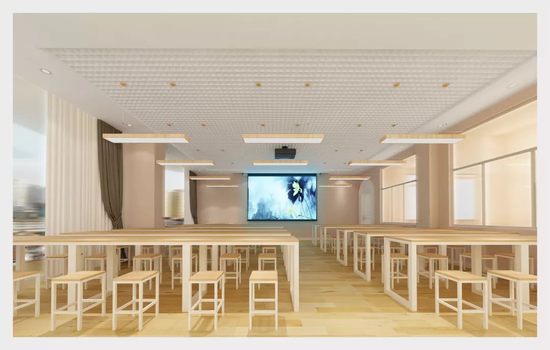 [課室] 隨性不羈的木桌運用,表達出空間的自在愜意,白色的清凈和兩邊窗戶的純粹貫穿全室,打造出明亮通透的視野感受;劃分出明確的使用區塊,補足了空間感的完整性。