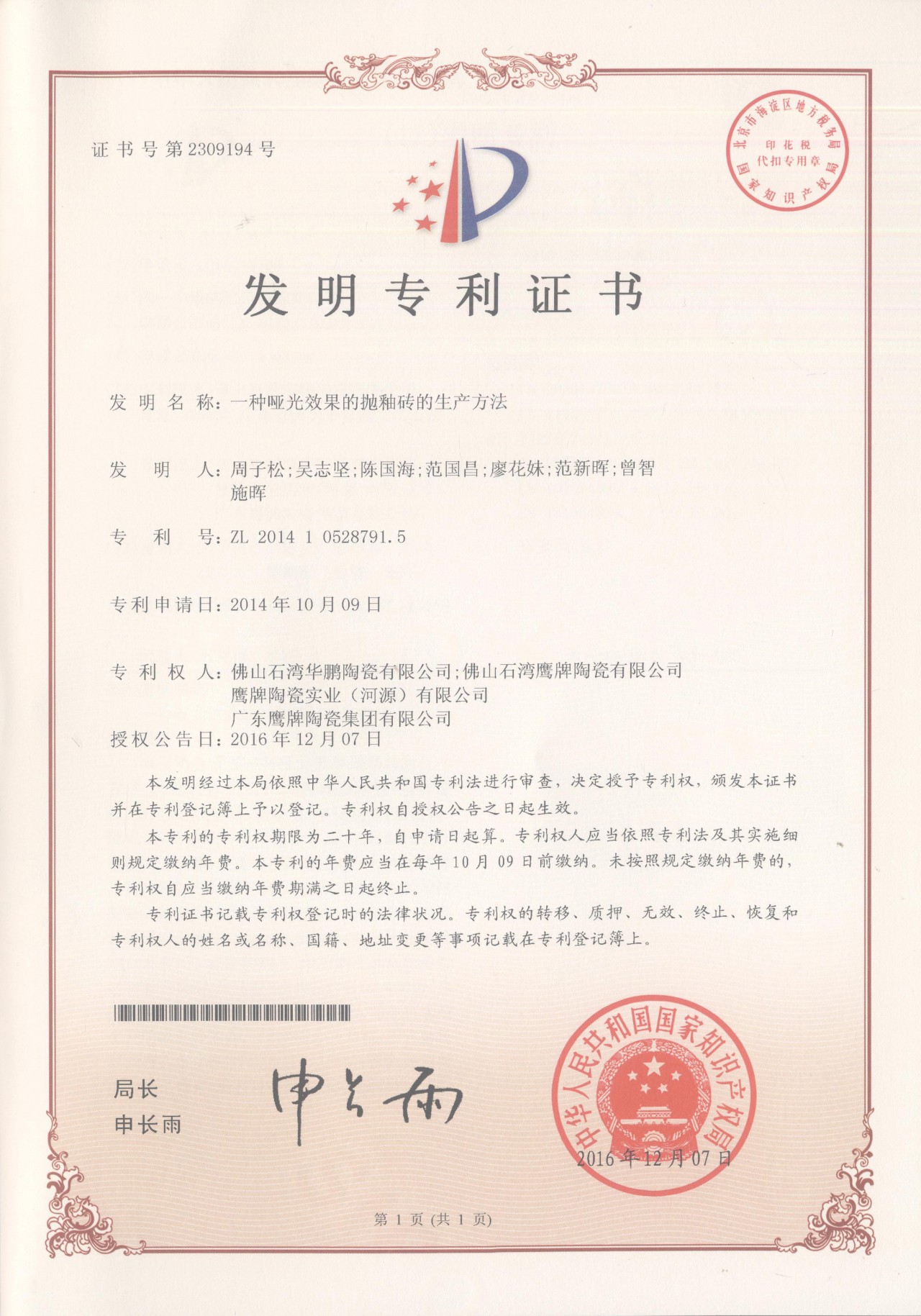 25年建陶行業生產經驗,華鵬形成穩定的產品研發體系和產品原創能力,更是在國家標準制定方面,充分發揮行業領軍企業之一的帶頭作用,成為國家行業標準制定單位、國家行業標準起草單位,獲得中國專利優秀獎,成為中國陶瓷行業科技創新型先進企業。
