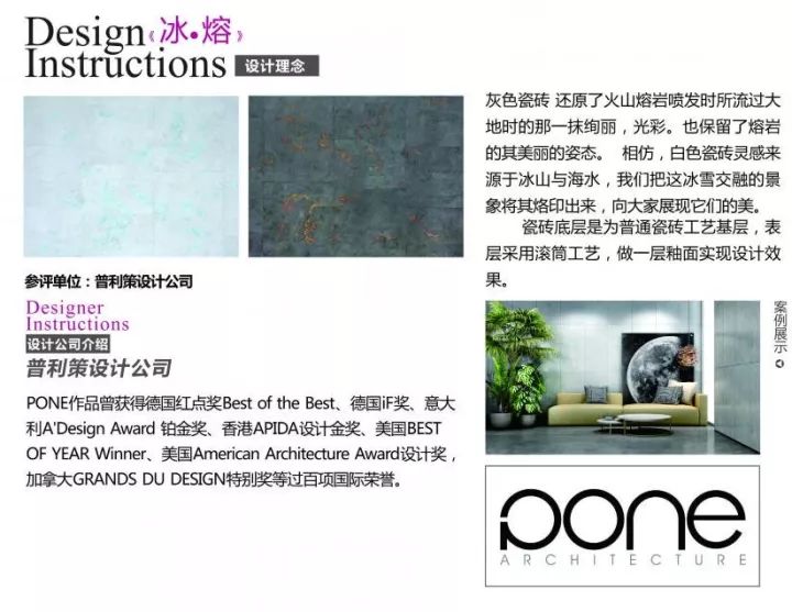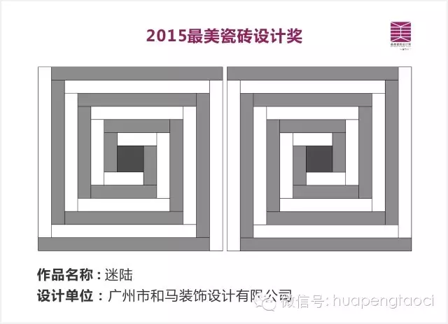 2015年,華鵬與廣州設計周合作,紅棉獎•設計概念獎首個專題獎項落定瓷磚產品領域,命名為“最美瓷磚設計獎”,公開征集“最美”的瓷磚產品設計概念方案,其中最美瓷磚設計獎獲獎作品由華鵬打版生產,轉化成瓷磚產品,使用在設計師的項目中,真正將設計和產業結合起來。