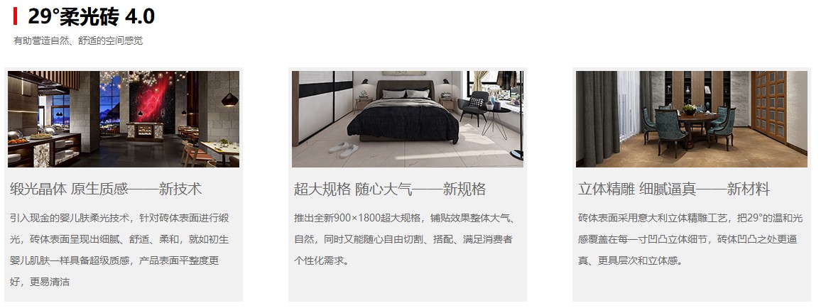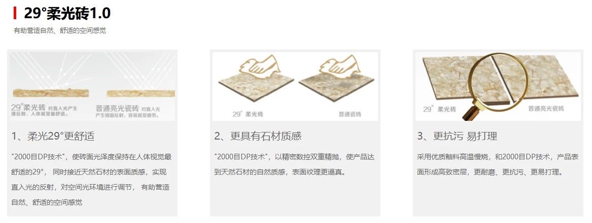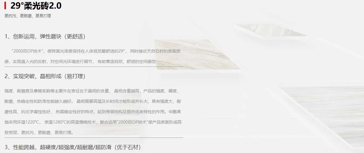 29°柔光3.0產(chǎn)品,突破行業(yè)常規(guī)的領(lǐng)先技術(shù)——意大利多重柔拋工藝,針對(duì)立體面的層次起伏進(jìn)行多重柔拋,實(shí)現(xiàn)從平面柔光到立體柔光。