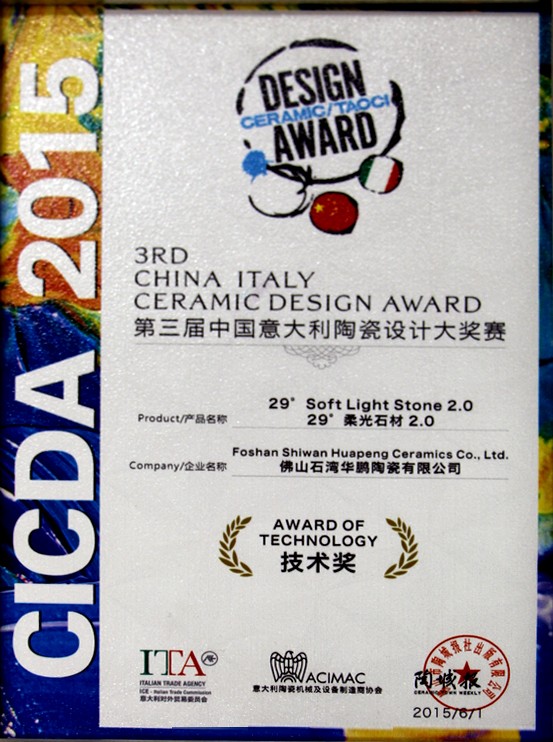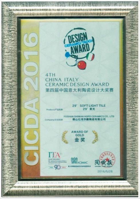 更是在由意大利對(duì)外貿(mào)易委員會(huì)、意大利陶瓷機(jī)械設(shè)備制造商協(xié)會(huì)、陶城報(bào)共同主辦的第四屆中國(guó)意大利陶瓷設(shè)計(jì)大獎(jiǎng)賽,華鵬陶瓷29°柔光產(chǎn)品力挫群雄,一舉拿下了本次大賽唯一一個(gè)金獎(jiǎng)。