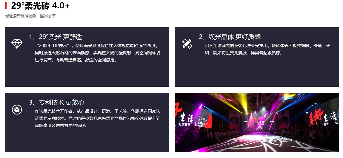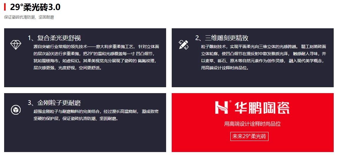 2013年,建陶行業(yè)從技術(shù)思維轉(zhuǎn)變?yōu)楫a(chǎn)品思維,在一片亮光磚產(chǎn)品中,華鵬開(kāi)始關(guān)注陶瓷產(chǎn)品的光感審美,開(kāi)創(chuàng)了柔光磚品類,專注打造舒適的人居環(huán)境。