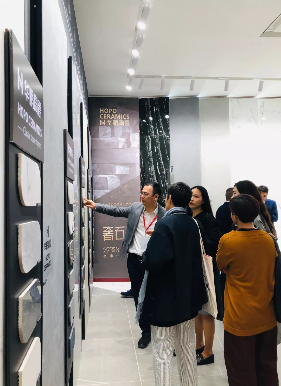 華鵬陶瓷營銷總經理姚松榕為米蘭設計師講解柔光產品歷程