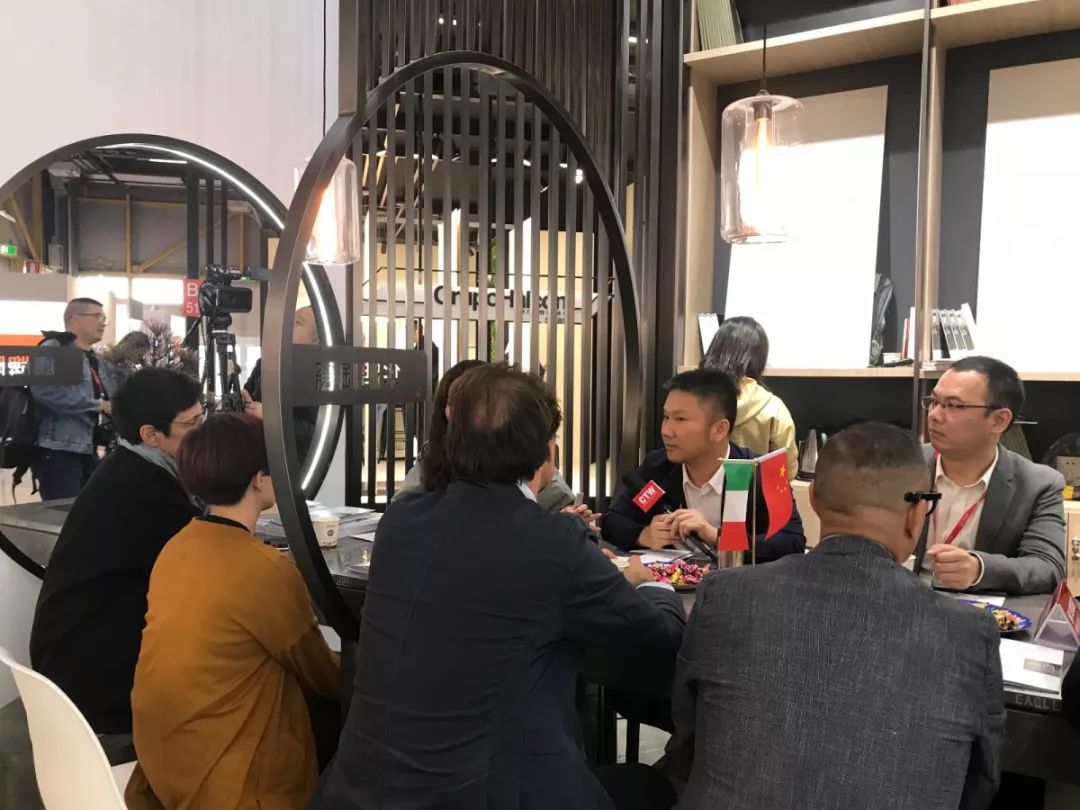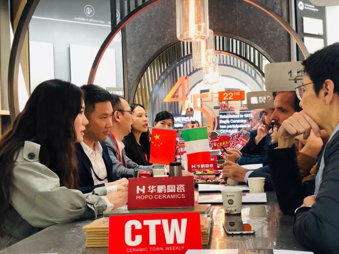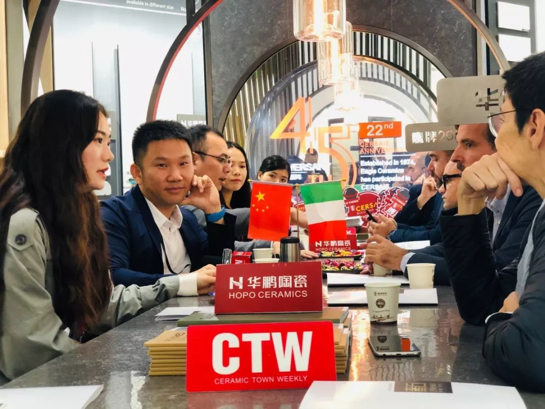 9月23日,博洛尼亞展開展的第一天,華鵬陶瓷就吸引了陶城報特邀的米蘭3個知名設計機構Lombardini22、STUDIO CR34、 Marta Meda architect and stylist,共6名設計師的關注,并與鷹牌集團副總裁陳賢偉、華鵬陶瓷營銷總經理就2019年博洛尼亞展展會趨勢展開了討論。