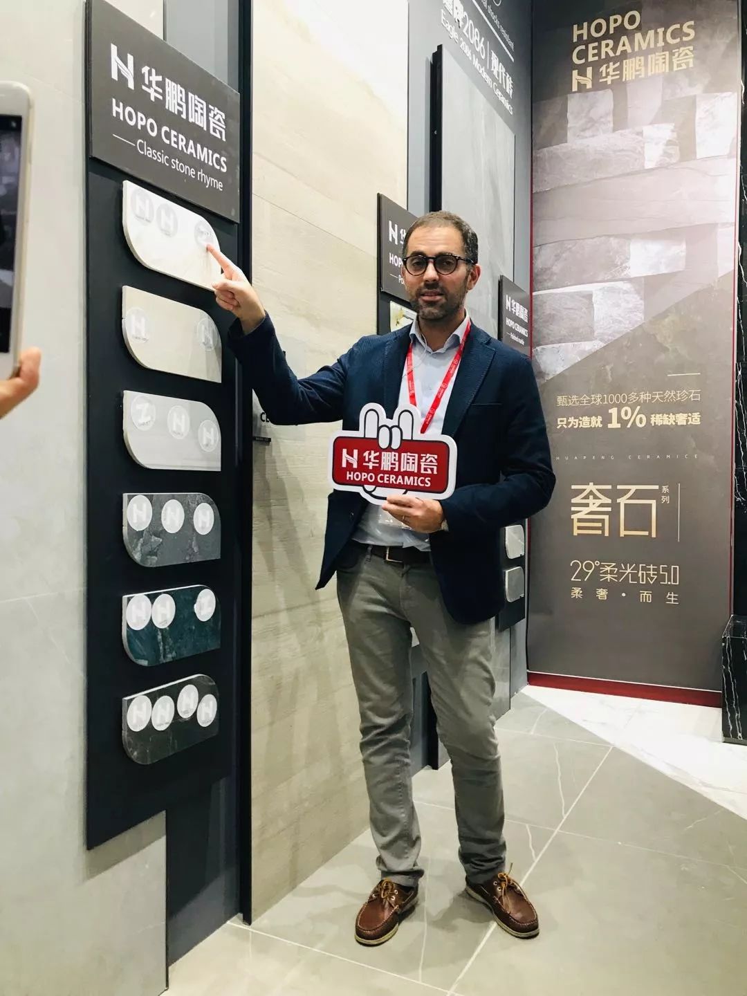 還未在國內發布的柔光5.0奢石系列新品,作為華鵬陶瓷的首發產品亮相博洛尼亞展。其中,微米級晶石粒子融合重塑、多層智控柔拋技術等復雜工藝更是令意大利設計師贊嘆,紛紛表示華鵬的高端柔光工藝已經達到國際領先水平,引領國際柔光工藝趨勢。