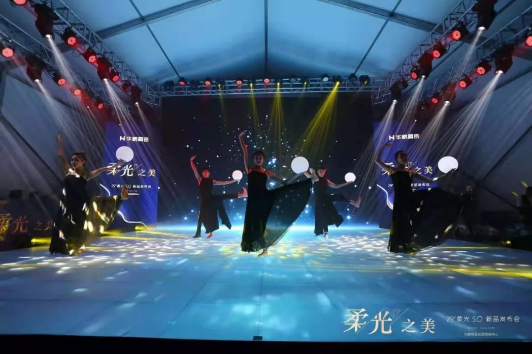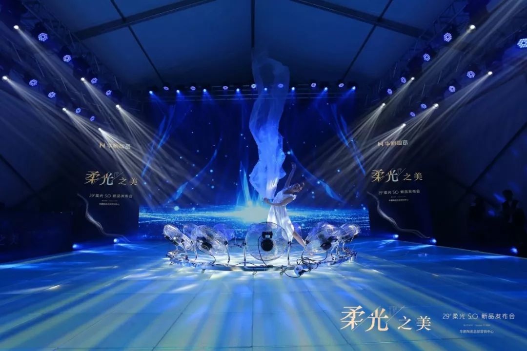 內場L型超大互動屏幕,營造全沉浸式體驗,光影穿梭,置身其中,仿佛穿越到另一個世界。舞蹈視頻互動秀,以情景舞蹈的形式,通過【聚變】、【尋覓】、【締造】、【突破】四幕,演繹陶瓷從無到有,華鵬不斷突破創新,柔光5.0由此而生的過程。