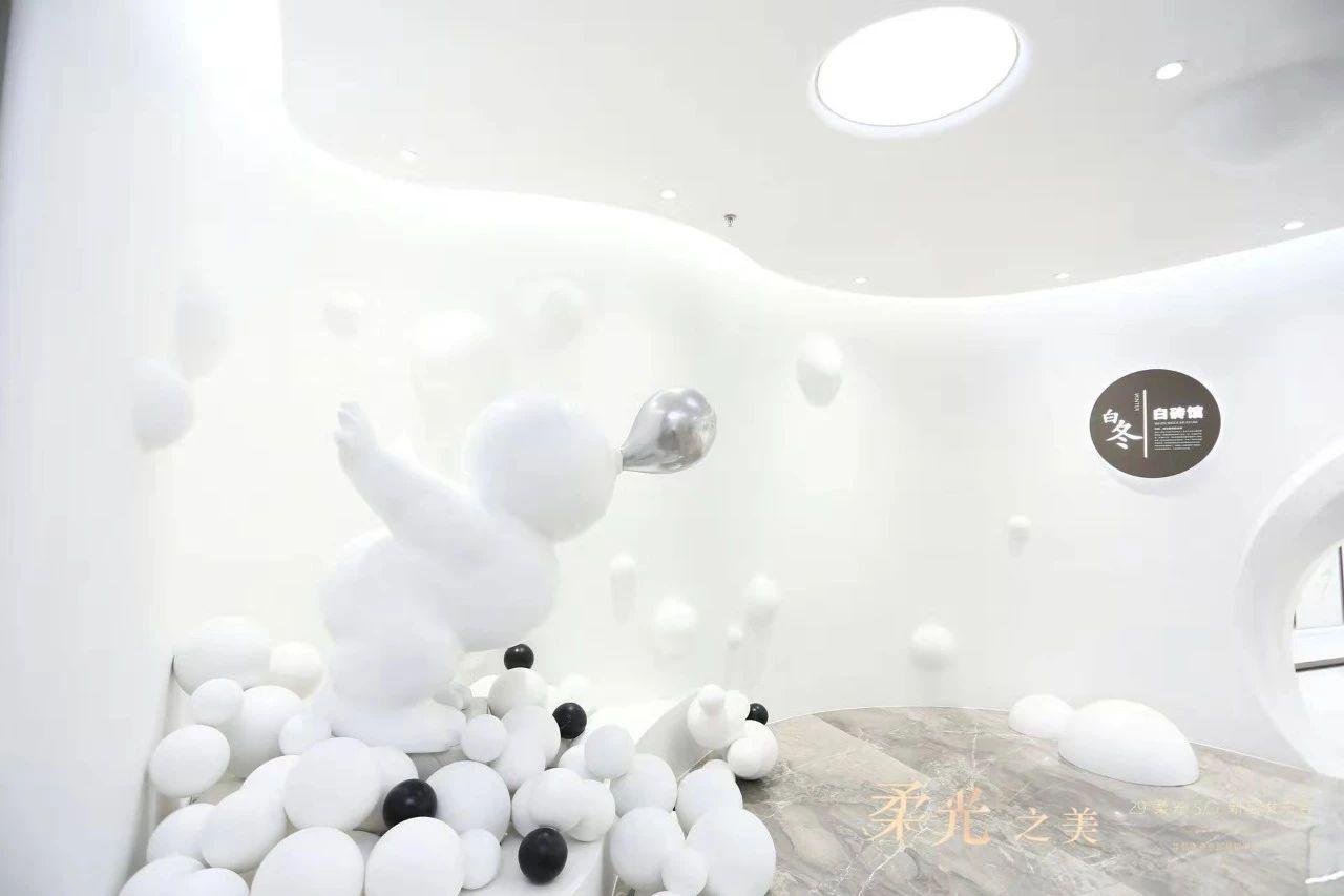 在展廳造型創意方面,結合華鵬“柔”的產品屬性,采用曲線、圓弧作為空間造型創意元素。