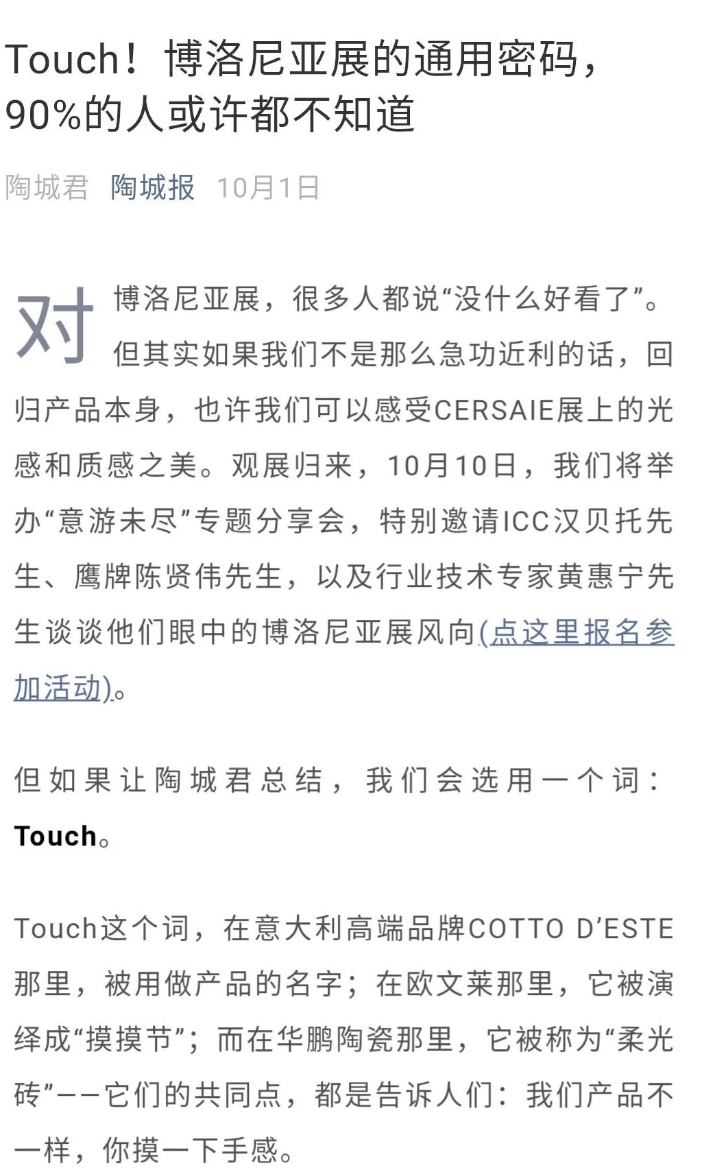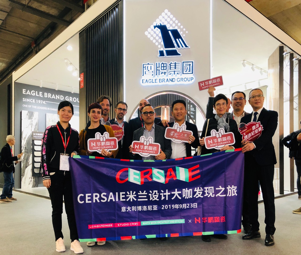 今年9月份,博洛尼亞展期間,陶城報組織的米蘭設計大咖發現之旅,到訪華鵬展位,一起探討2019年博洛尼亞展展會趨勢。國際設計師的目光,再次投射到華鵬柔光磚上,華鵬陶瓷柔光磚品牌形象再次得到強化。