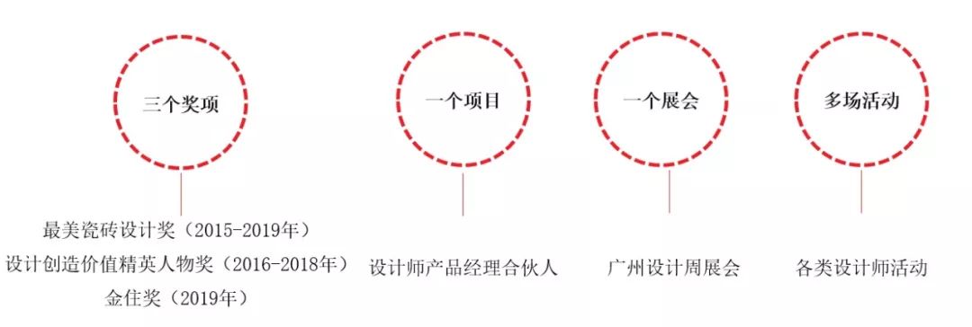 目前已形成以“最美·設計師俱樂部”為依托的資源整合平臺,為終端渠道拓展、維護、轉化提供資源。其中涵蓋三個獎項——“最美瓷磚設計獎”、“設計創造價值精英人物獎”、“金住獎-中國居住空間設計年度評選”,一個項目——設計師產品經理合伙人,多場活動。