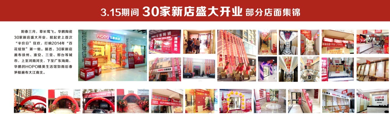 陽春三月,草長鶯飛。華鵬陶瓷30家新店盛大開業,掀起史上首次半價日狂歡,打響2014年百花綻放第一炮。