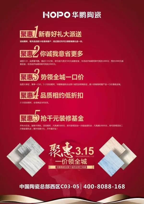 華鵬陶瓷聯(lián)合市場(chǎng)部以及銷(xiāo)區(qū)經(jīng)理、終端經(jīng)銷(xiāo)商,在全國(guó)范圍內(nèi)進(jìn)行了聚惠3.15;一價(jià)領(lǐng)全城的品牌銷(xiāo)售活動(dòng)。