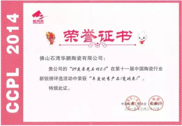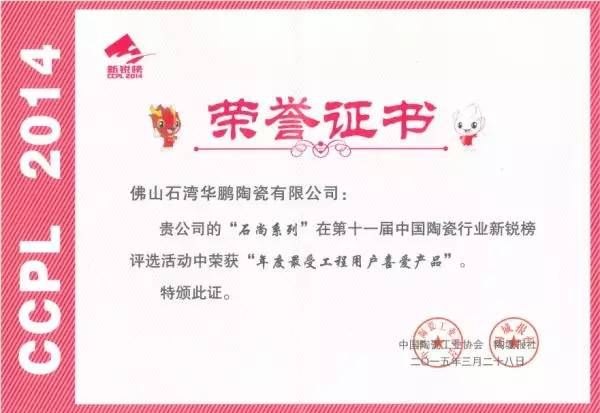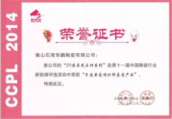 被奉為中國陶業的“奧斯卡”獎的新銳榜,是目前中國建瓷行業中覆蓋面最廣、影響力最大、評選結果最具權威的評選活動。華鵬陶瓷從眾多參選企業中脫穎而出,榮獲“年度優秀產品”、“年度最受設計師喜愛產品”、“年度最受工程用戶喜愛產品”榮譽稱號,成為頒獎晚會霓虹追逐的焦點。這是對華鵬陶瓷對過去一年創新成果的肯定,也充分說明華鵬陶瓷產品得到了來自行業、合作伙伴、消費者的廣泛認同和追捧。