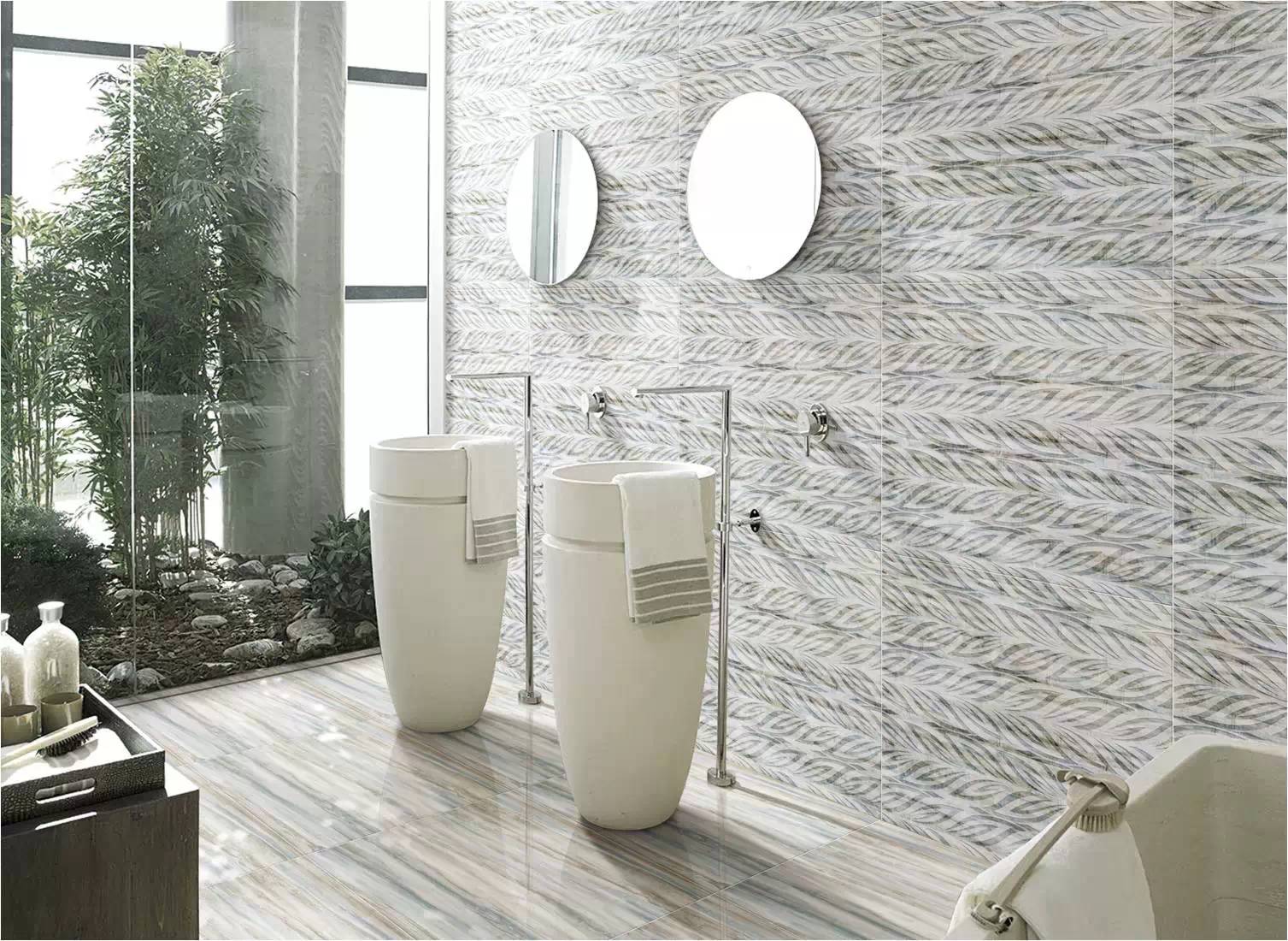 衛浴間是一個完全放松身心的私密空間,沖洗沐浴的時候尤其需要放松的感覺。光面而且反光性強的瓷磚不適合用于衛生間,因為刺眼的光線會讓人不舒服。衛浴間也是個需要經常打掃保持清潔的地方,但與廚房相比,衛浴間的墻面不會產生太多難以清除的污漬,故柔光類及亞光類的瓷磚足以滿足需要。