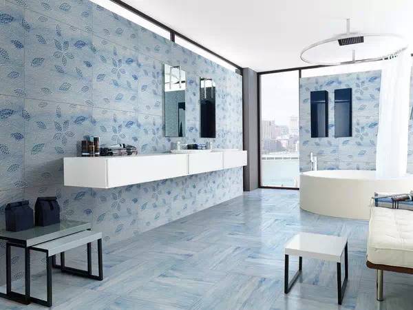 空間解說:29度柔光石材2.0系列之藍金沙——通過透視化的視覺表達出一幅極具藝術風格的插畫圖案,片狀的藍色樹葉點綴其中更顯輕盈夢幻。