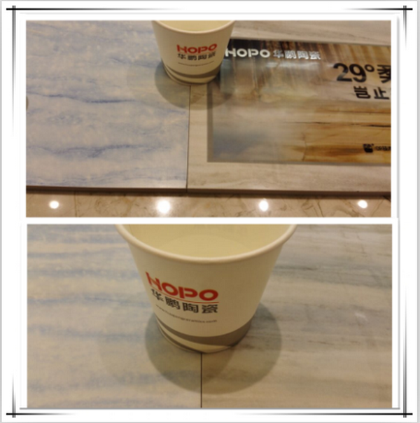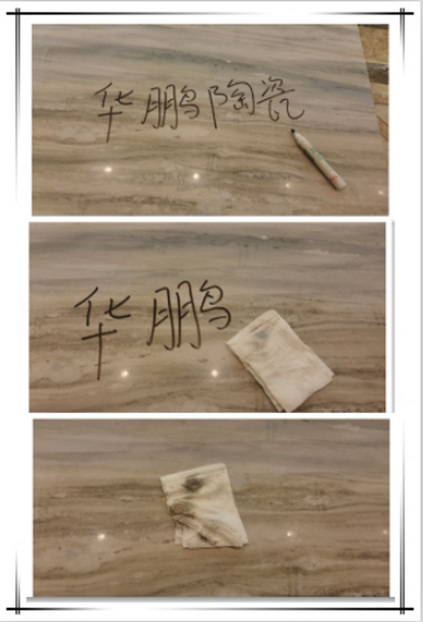 用油性筆在瓷磚表面寫上華鵬陶瓷,用紙巾輕輕一抹,就可擦掉筆跡,擦拭后瓷磚的表面依舊透亮。說明此款瓷磚的耐污性強,容易清潔