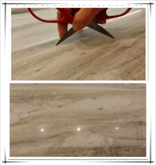 瓷磚的耐磨性關系到產品的使用壽命,所以備受消費者的關注。如果有劃痕,就說明瓷磚的耐磨度不高,試想如果耐磨度不高,沒用多久的瓷磚就會變成大花臉了。測評員用剪刀在瓷磚表面來回刮劃,結果瓷磚表面沒有絲毫的損傷,無任何痕跡。可見其耐磨性還是十分優越的,經得起使用的考驗。