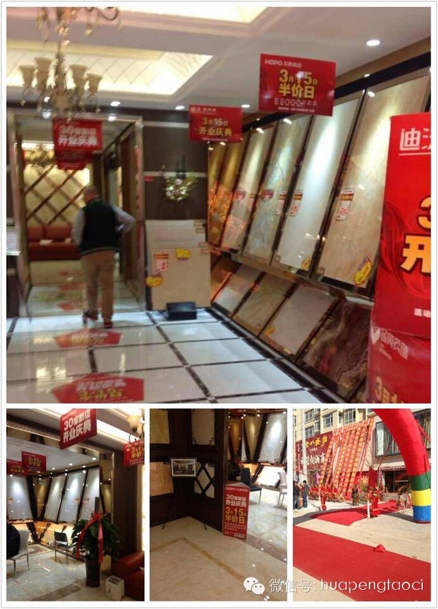 陽春三月,草長鶯飛。華鵬陶瓷30家新店盛大開業,掀起史上首次“半價日”狂歡,打響2014年“百花綻放”第一炮。據悉,30家新店遍布石家莊、鄭州、洛陽、徐州、江陰、無錫、淮安、泰州、南昌、棗莊、晉江、漳州、三亞等城市,上至河南河北,下至廣東海南,華鵬的HOPO精英生活館如雨后春筍般遍布大江南北。