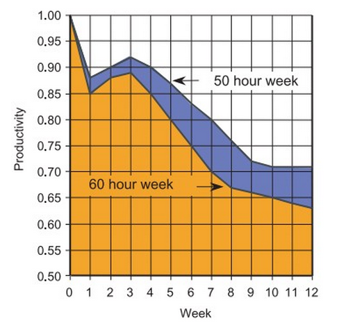 事實上,無論從長期還是短期來看,工作時間越長,工作效率和效益就越低。如果連續兩個月,每周都工作超過60個小時,你的生產力下降甚至會導致整個工期效率的下降。而同樣的工作,一周40個小時就夠了。