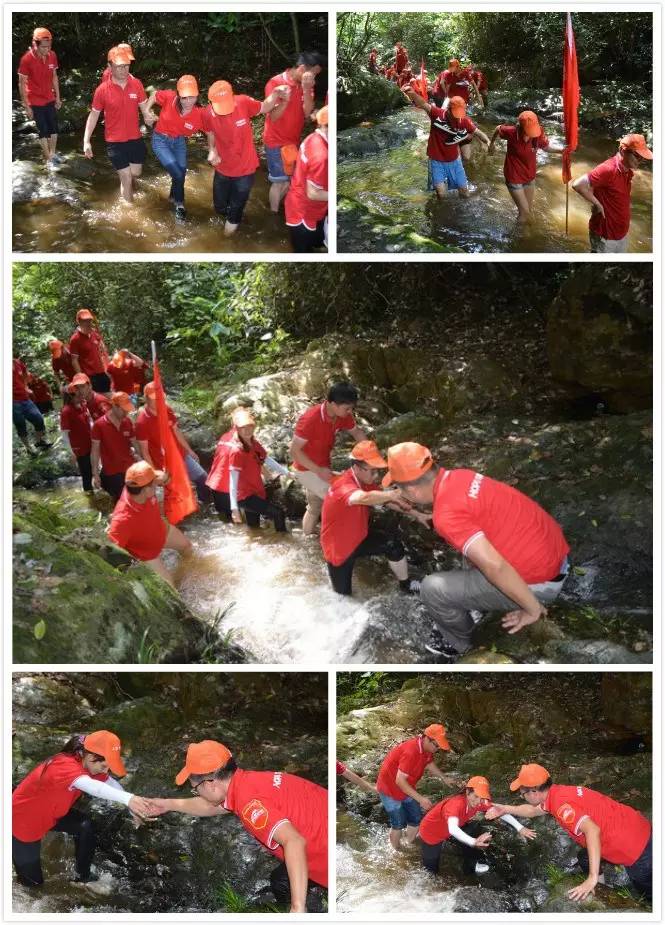 山溝溯溪對于溯行者本人及所在團隊的協作能力是一種嚴峻的考驗:需要同伴之間的密切配合,利用團隊精神,去完成艱難的攀登。由于水流緩急,溪間路滑,途中有不少同事滑倒,全身濕透,但都絲毫沒有退縮抱怨,勇敢的站起來繼續前進。