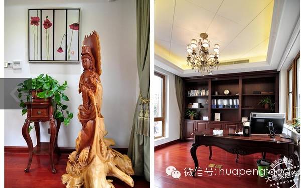 書房:深褐色的實(shí)木桌椅、書柜,營(yíng)造了書房的靜謐氛圍。精致的根雕又在訴說(shuō)著主人對(duì)傳統(tǒng)文化的尊崇和喜愛(ài)。