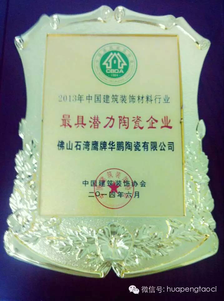 華鵬陶瓷榮獲2013年”中國建筑裝飾材料行業(yè)最具潛力陶瓷企業(yè)“