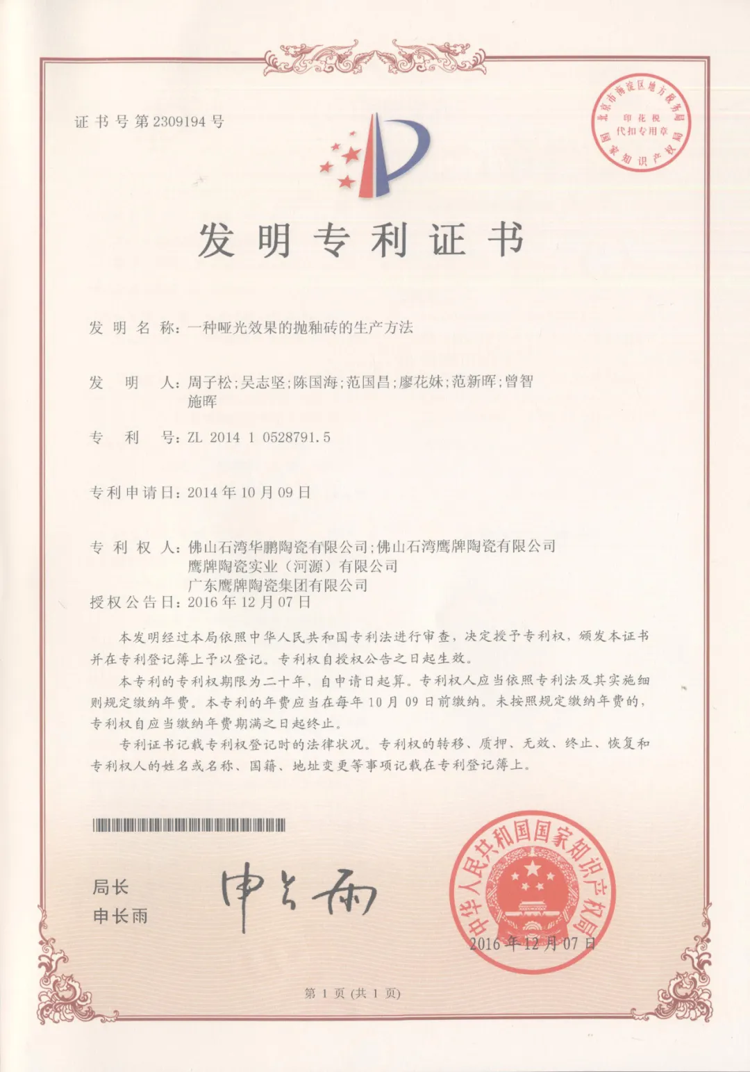 ? 2016 年,華鵬 29°柔光技術(shù)獲“發(fā)明專利證書”,標(biāo)志著行業(yè)柔光磚標(biāo)準(zhǔn)正式形成,同時也確定了華鵬柔光磚領(lǐng)導(dǎo)品牌”定位。