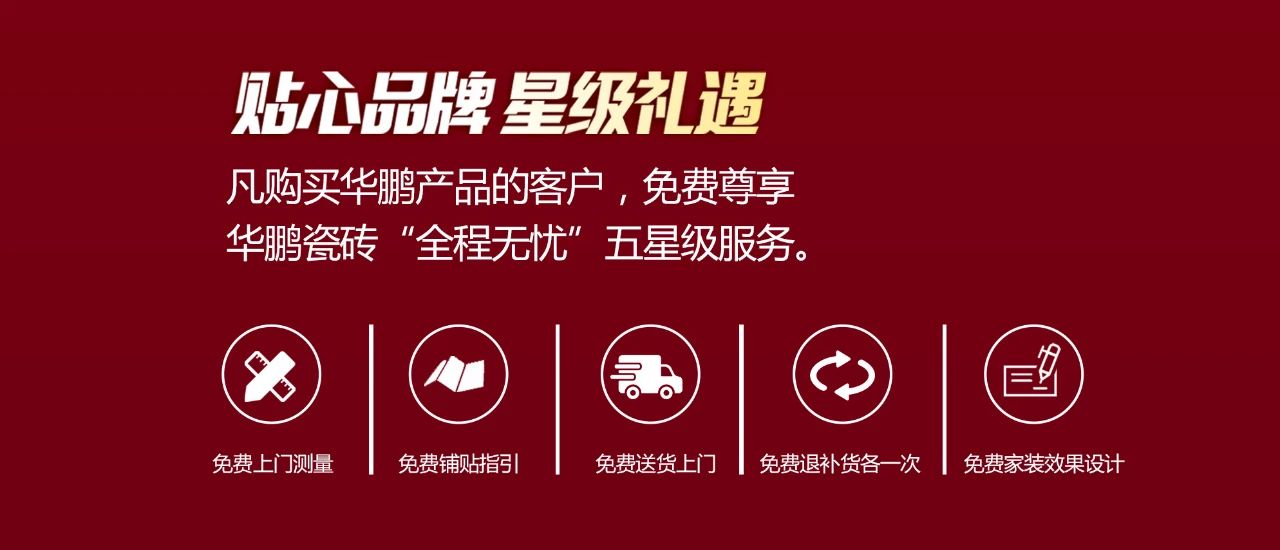 活動期間凡購買華鵬陶瓷客戶,完成裝修后將實景圖發送至當地華鵬陶瓷專賣店,即可獲得88元紅包一個!5月12日-5月30日,華鵬陶瓷河南漯河、安陽、鄭州、三門峽、濟源,更多新品,更多優惠,不玩套路,給力低價,疫后裝修,看過華鵬再下單!(更多優惠詳情店內咨詢)華鵬陶瓷更有貼心品牌 星級禮遇凡購買華鵬產品的客戶,免費尊享華鵬瓷磚“全程無憂”五星級服務。