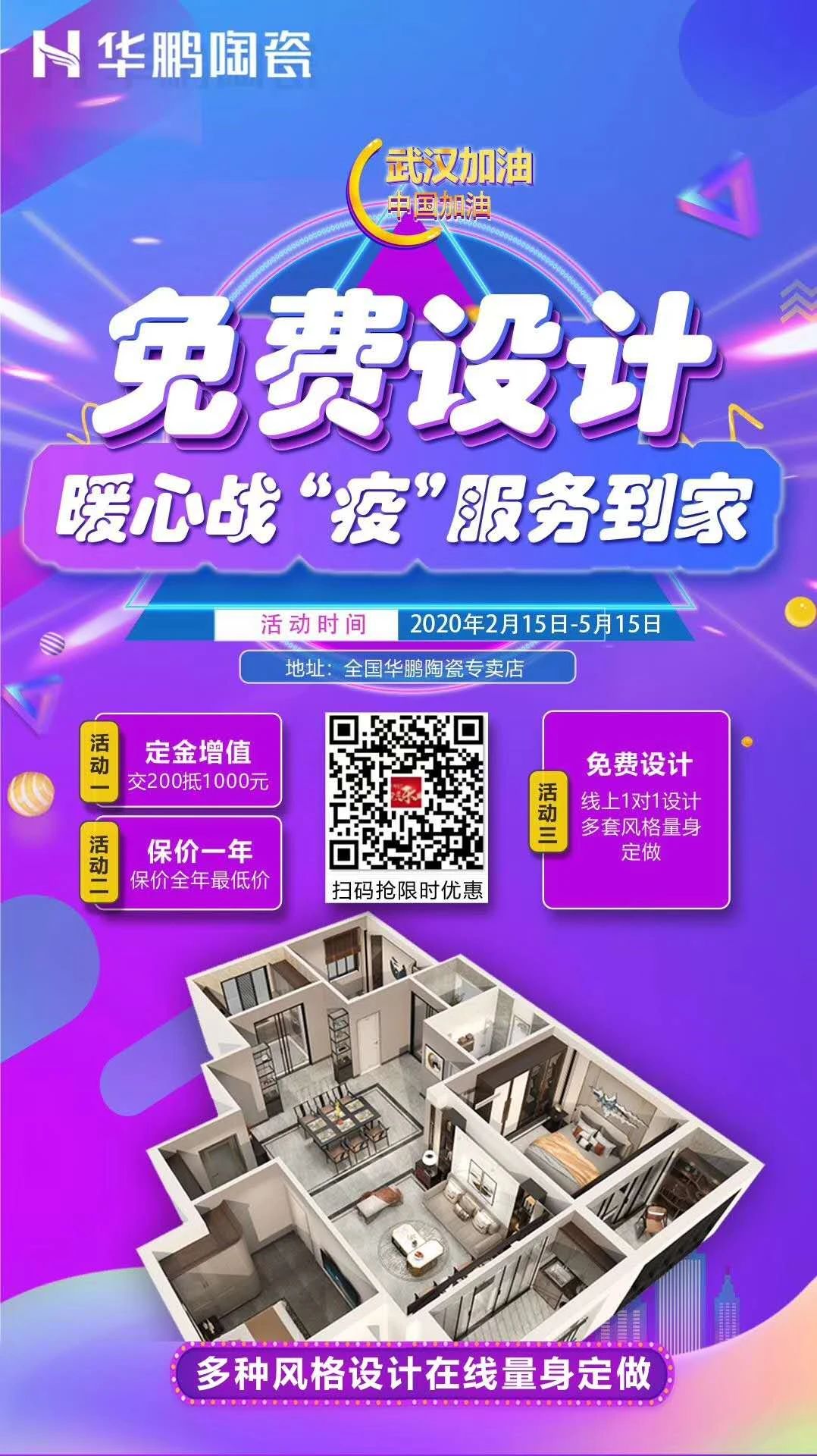 升級線上服務(wù)渠道,在線裝新家,免費設(shè)計,抗擊疫情,服務(wù)更用心,華鵬陶瓷疫情期間開啟線上裝修通道,幫助消費者足不出戶裝新家,輕松搞定線上裝修設(shè)計服務(wù)。