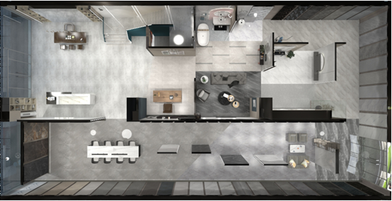一層:大堂形象區+(選材區+培訓區)+場景空間展示(茶室/書房/廚房/衛浴)