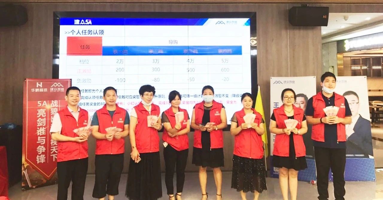 項(xiàng)目啟動(dòng)之初,華鵬陶瓷幫扶小組和建眾老師就組建種子選手團(tuán)隊(duì),設(shè)立5A項(xiàng)目作戰(zhàn)指揮中心,隨后種子選手一對一駐點(diǎn)5A項(xiàng)目各作戰(zhàn)站點(diǎn),到門店展開銷售PK、團(tuán)隊(duì)PK,5A項(xiàng)目銷售PK機(jī)制隨即開啟。