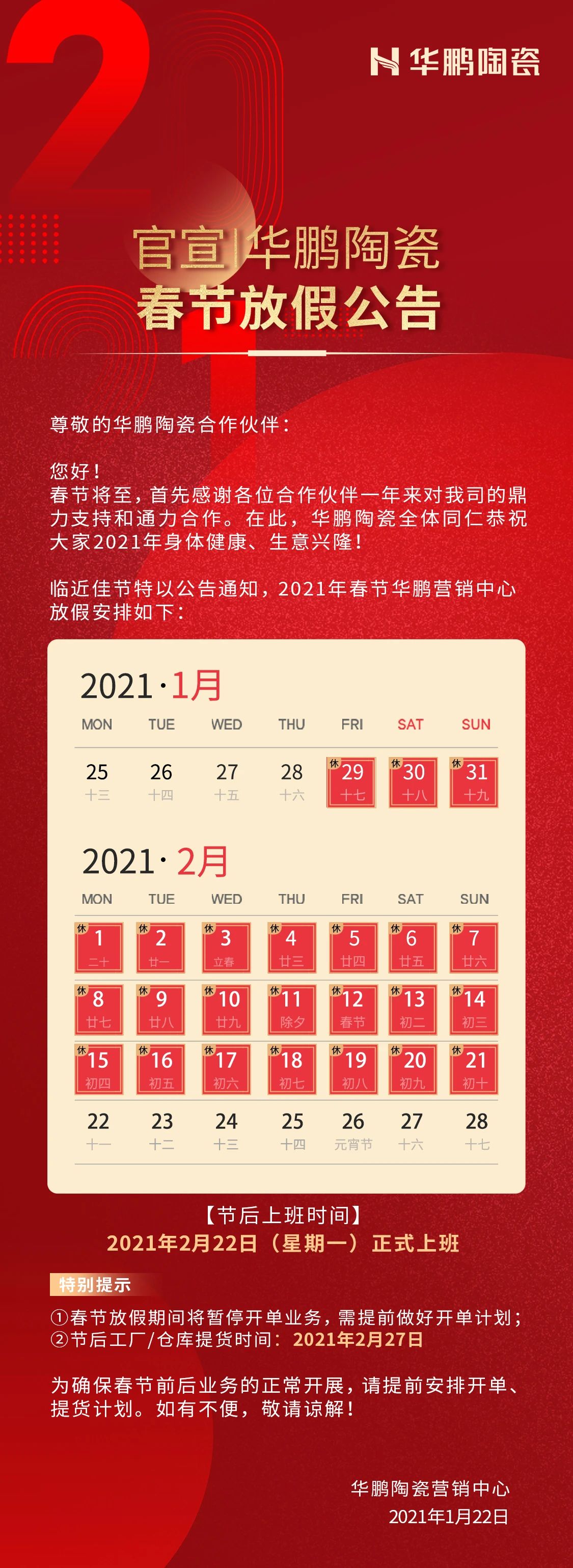 官宣 | 華鵬陶瓷春節放假公告