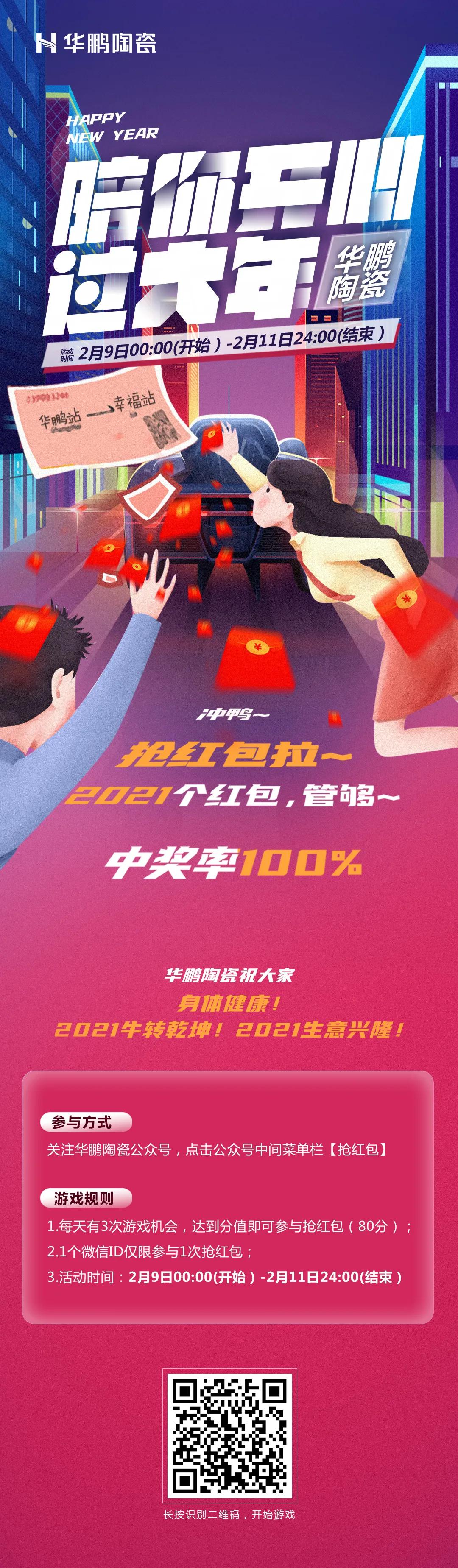 關注華鵬陶瓷公眾號,點擊公眾號中間菜單欄【搶紅包】,即可參與!