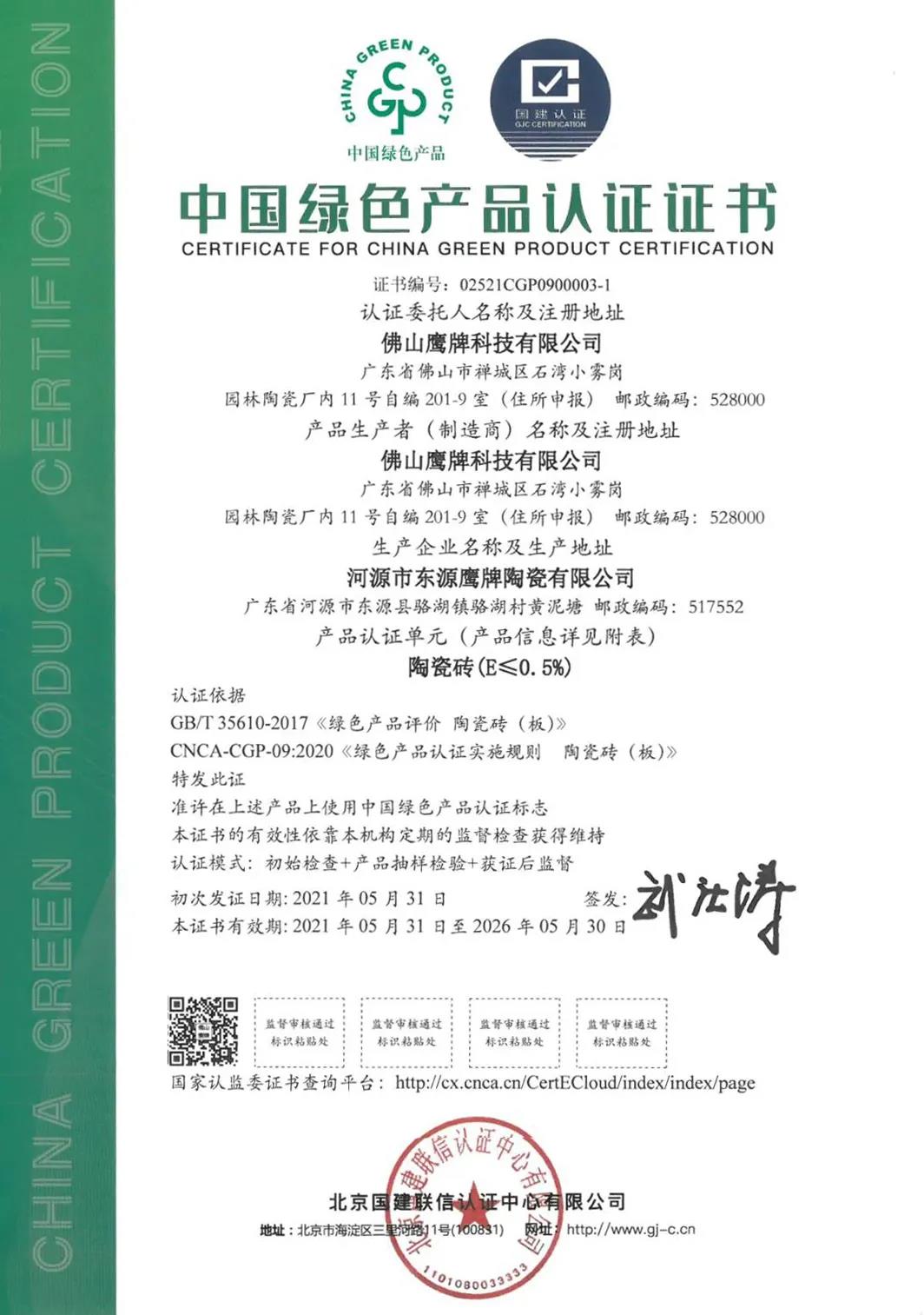 近日,華鵬陶瓷榮獲由國(guó)家市場(chǎng)監(jiān)督總局批準(zhǔn)的認(rèn)證機(jī)構(gòu)頒發(fā)的“中國(guó)綠色產(chǎn)品認(rèn)證”證書(shū),華鵬陶瓷產(chǎn)品被認(rèn)定為綠色、健康、環(huán)保、高品質(zhì)認(rèn)證。