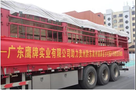11月2日下午,在禪城區、石灣鎮相關領導以及鷹牌公司員工的一同見證下出發,掛有“廣東鷹牌實業有限公司捐贈物資”橫幅的10輛車隊,馳行744公里,于11月3日下午到達貴州省黔東南州錦屏縣。