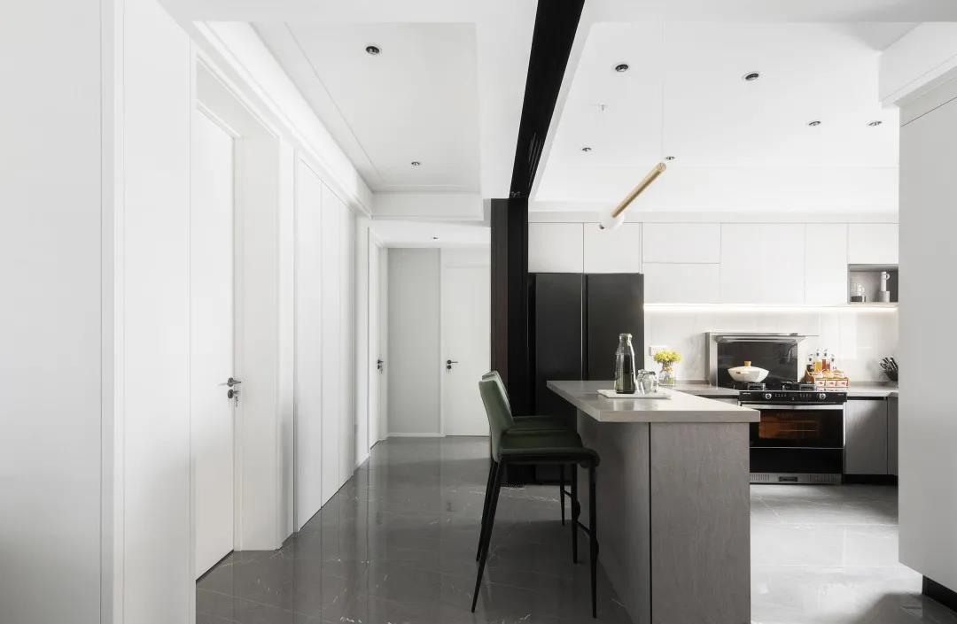 廚房的操作臺選用灰色大理石面板增添了空間的輕奢氛圍,整體簡約而精致。
