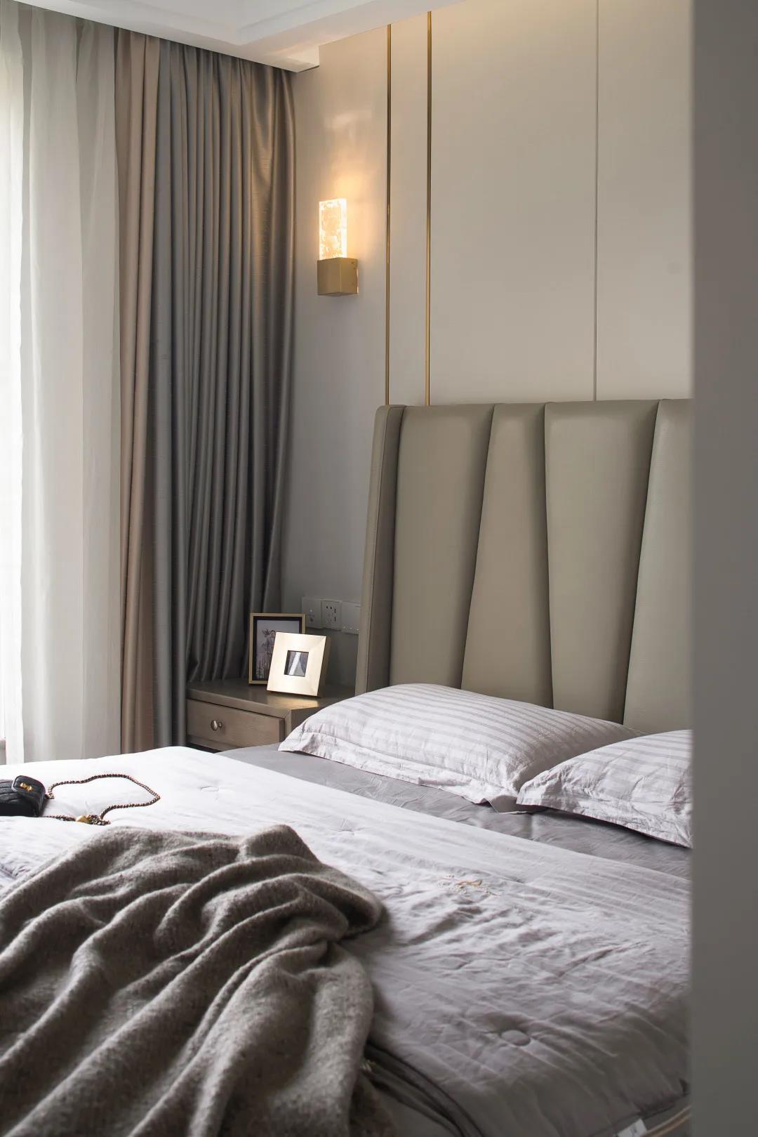 臥室內(nèi)最具特色的當(dāng)屬床頭墻面的設(shè)計,白色背景墻夾雜著黃銅金屬風(fēng)格,互相中和了彼此的色彩,讓空間略點輕奢感,處于一個最具平衡的狀態(tài)。