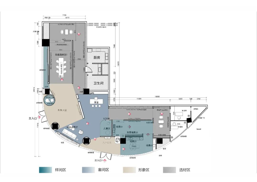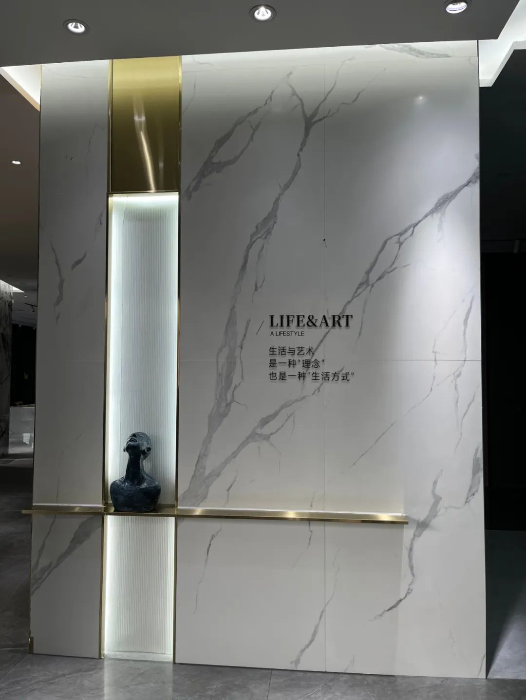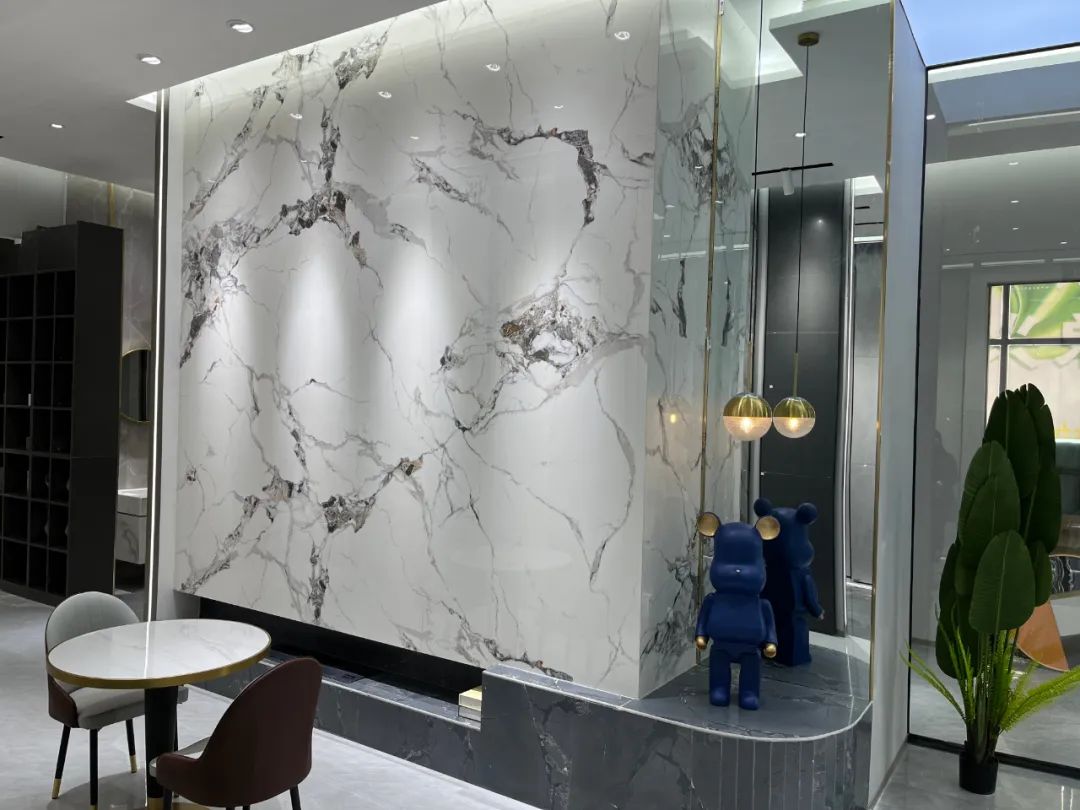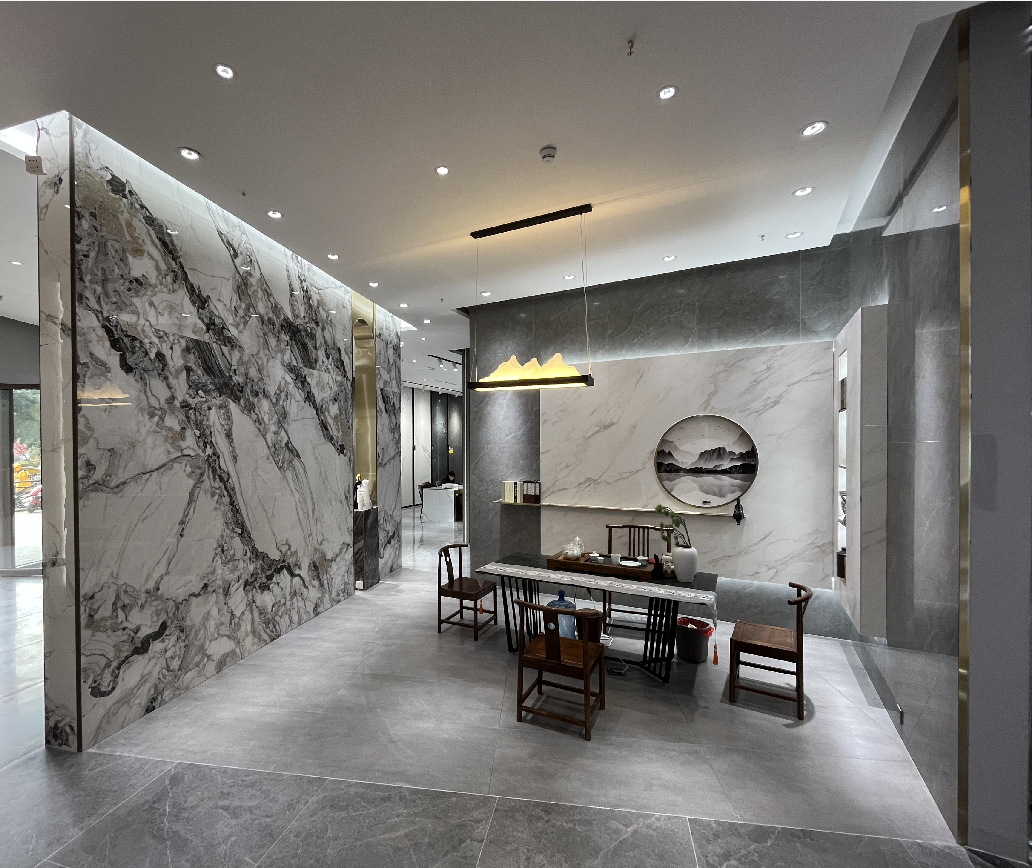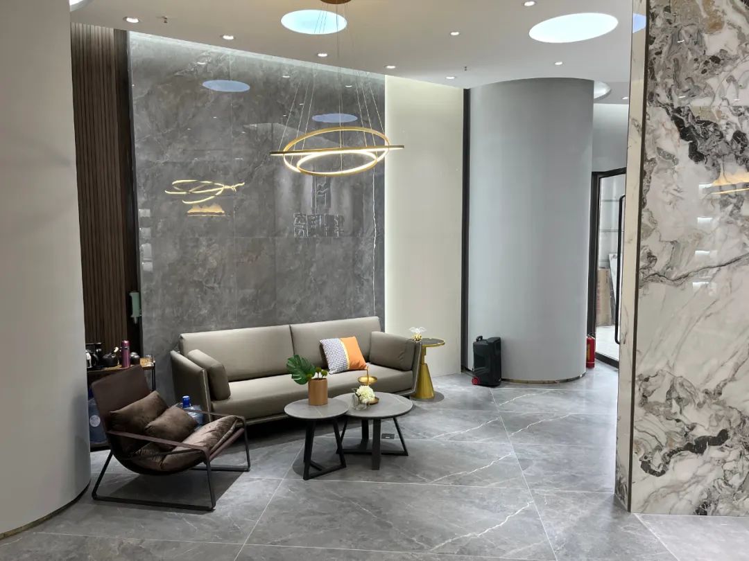 開門見景,旗艦店大門采用弧形設計,用色彩碰撞的方式吸引眼球。直入眼簾的是品牌展示中心,大廳作為中心地帶,也是接待客人最重要的地方,大廳采用29°柔光900*1800寶格麗冰河白連紋產品,高級感十足。
