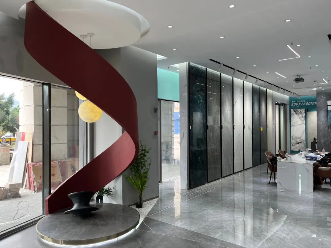 大廳左側的螺旋藝術設計非常具有儀式感,像一條靈動的紐帶,表達了陶瓷十大品牌華鵬陶瓷29°柔光的柔性之美,驅動著空間邏輯成立,設計師大膽的用色把整個樓梯空間變成一件亦景悅心的大型藝術品,標新立異卻又恰如其分的為品牌加分。