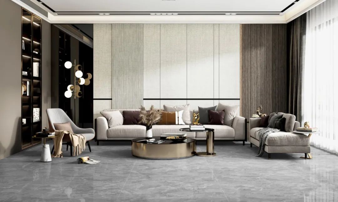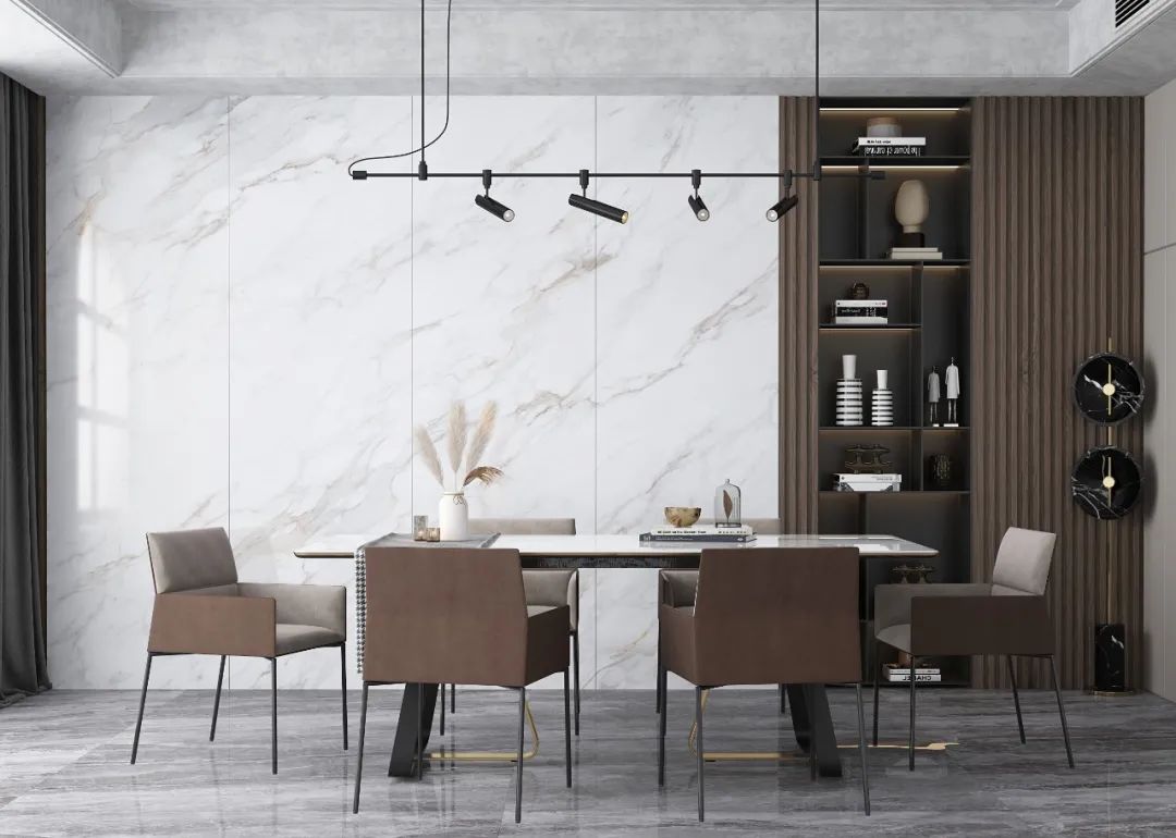 餐廳的設計在細節上精雕細琢,墻面采用一片到頂的大規格瓷磚,仿若高山開鑿的天然石,溫潤的肌理經大自然細膩的勾勒、描繪,如生命般律動。每一處都倍顯溫暖與靈動。搭配灰色餐桌,時尚且美觀,給人滿滿的溫馨感。